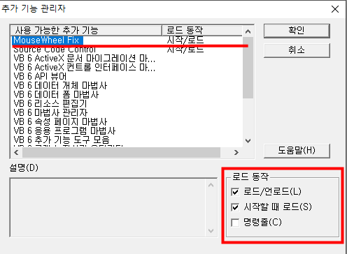 7. 아래의 이미지와 같이 MouseWheelFix 를 선택 후 로드 동작을 체크 함.