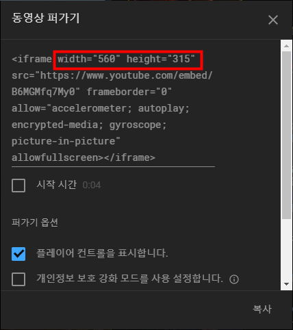 유튜브에서 공유하기 해서 소스보기로 소스를 퍼오게 되면 크기가 고정이 되죠