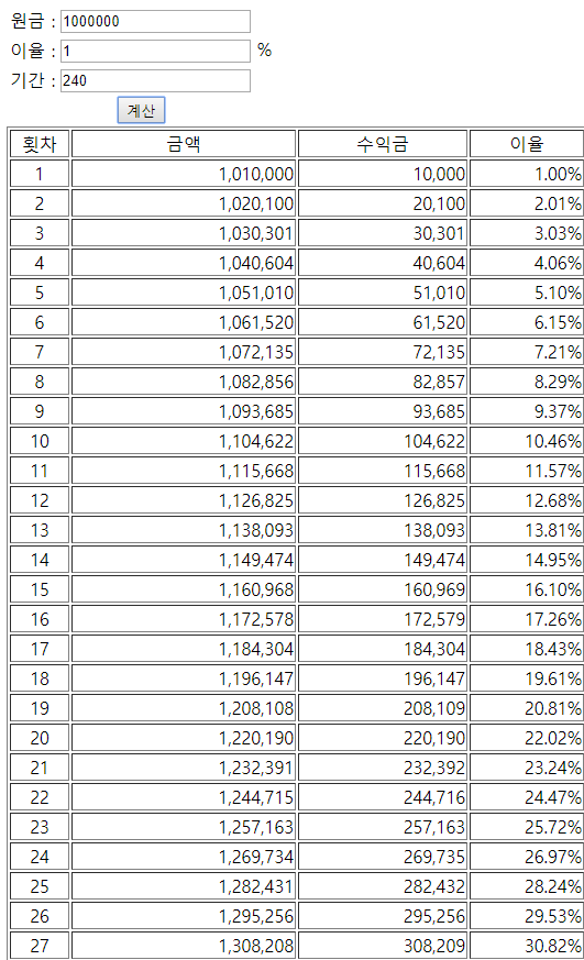 그래서 html 과 javascript 로 간단한 일복리 계산기를 한번 만들어 봅니다. ^^