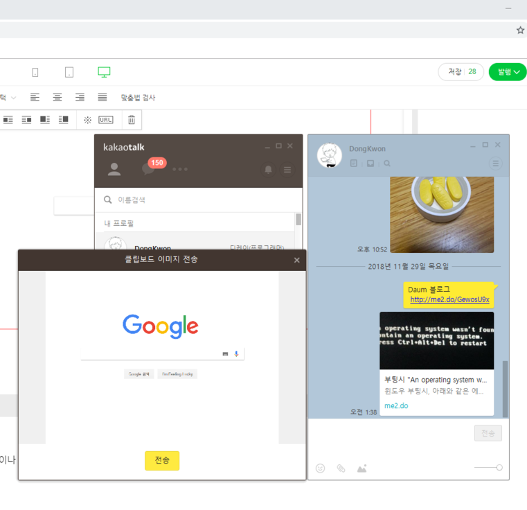 - 그리고 카카오톡 채팅방이나 이미지를 붙여넣기 할 수 있는 곳에 CTRL+V (복붙) 한다.