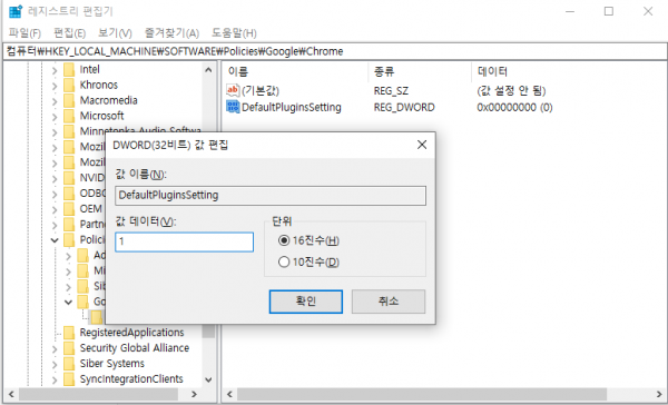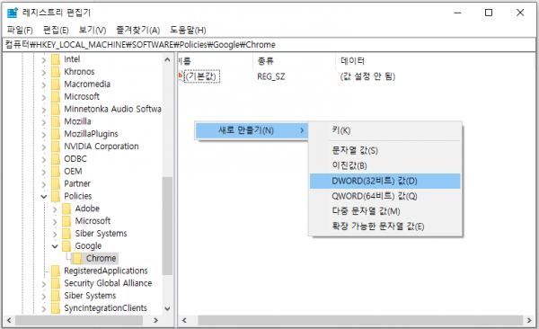 - 마우스 오른쪽 버튼을 눌러 Chrome 에 DWORD(32비트) 값을 클릭한 후 DefaultPluginsSetting 이라는 값을 만들어줍니다.