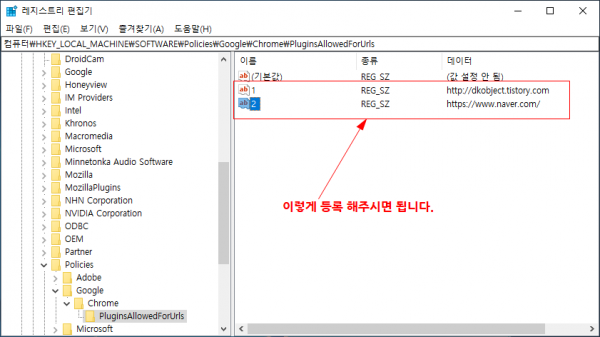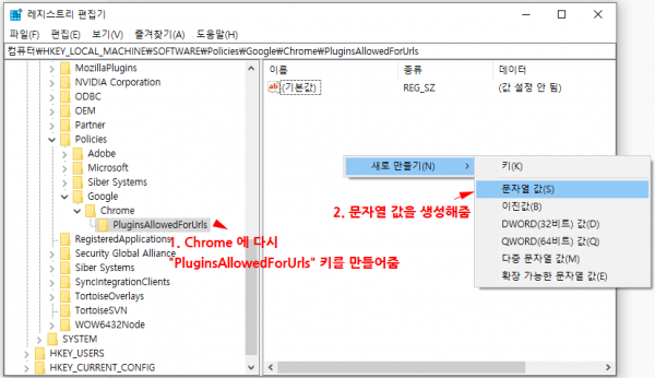 - Chrome 하위에 다시 "PluginsAllowedForUrls" 를 생성을 해주고 거기에 문자열 값을 생성한뒤 플래시를 항상 허용할 사이트를 등록해준다.