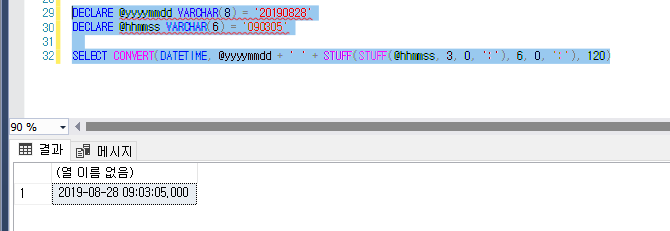 DATETIME형식의 '2019-08-28 09:03:05.000'으로 변환 합니다.