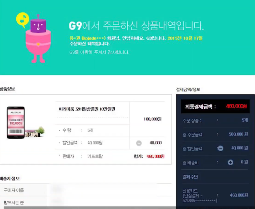 지는 지 9에서의 피해액이 존재했으며 결제 내역은 상품권 내역이었습니다.