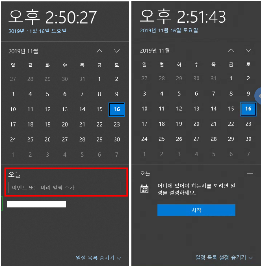 아래와 같이 작업 표시줄의 캘린더 플라이 아웃에서 곧바로 이벤트가 생성 가능합니다.