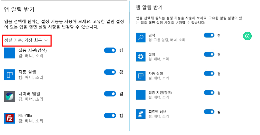 설정-시스템-알림의 알림 설정은 이제 보낸 사람 이름이 아니라 가장 최근에 표시된 알림별로 알림 보낸 사람을 정렬하도록 기본 설정됩니다.